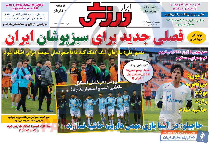 عناوین روزنامه ابرار ورزشی دوشنبه ۱۳ اسفند ماه به شرح زیر است :