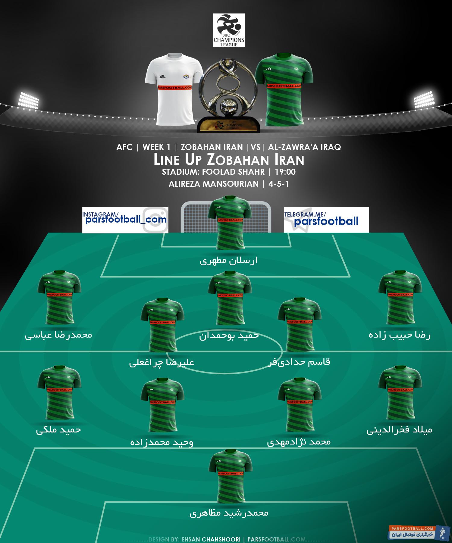 در اولین دیدار تیم فوتبال ذوب آهن ایران در رقابت های لیگ قهرمانان آسیا برای مصاف با الزورا عراق، علیرضا منصوریان یازده بازیکن خود را انتخاب کرد.