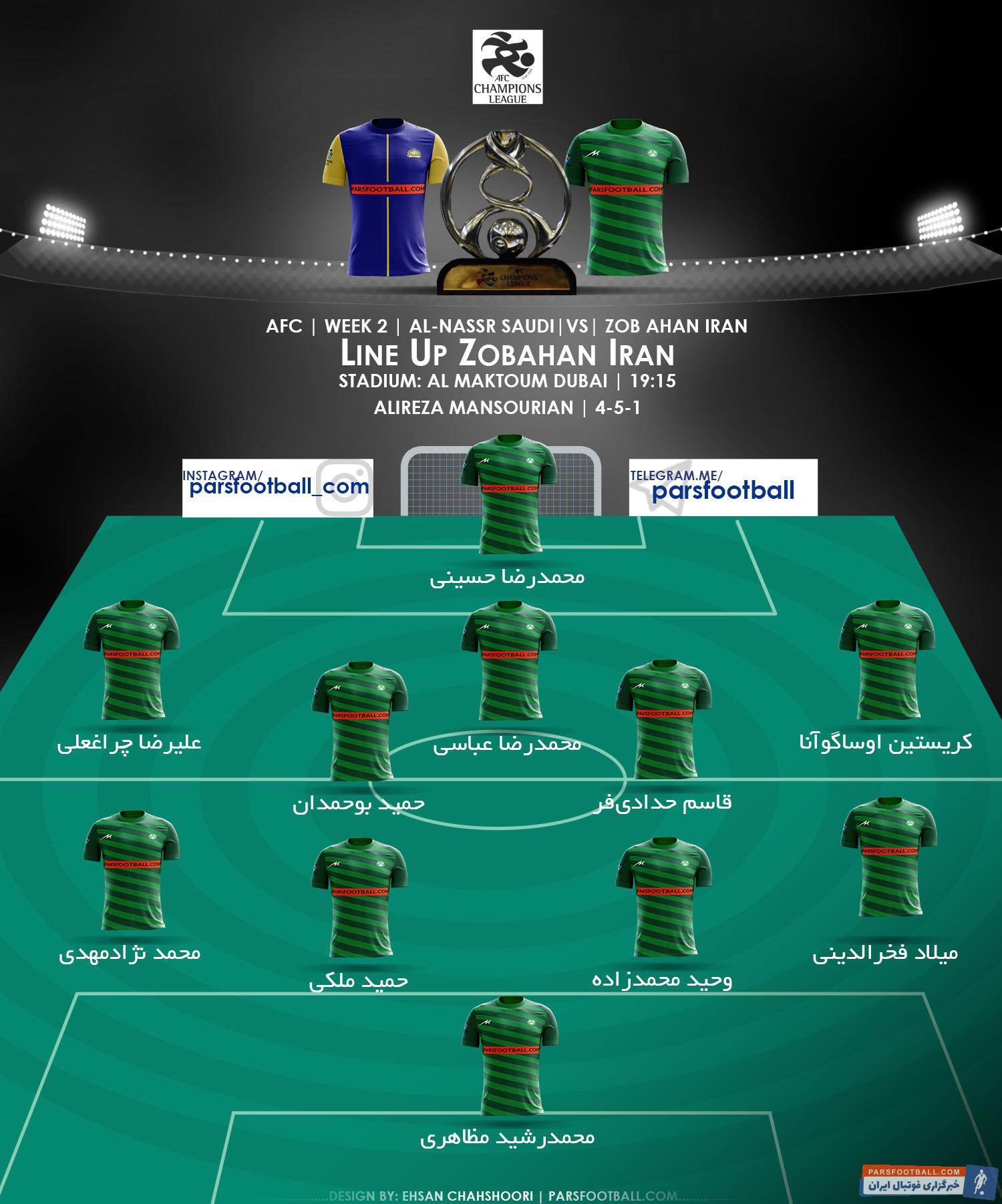 ذوبآهن در دومین دیدار آسیایی خود با ترکیب محمدرشید مظاهری، محمد نژادمهدی، وحید محمدزاده، میلاد فخرالدینی، حمید ملکی، حمید بوحمدان، قاسم حدادیفر، علیرضا چراغعلی، سید محمدرضا حسینی، محمدرضا عباسی و کریستین اوساگوآنا به مصاف النصر عربستان میرود.