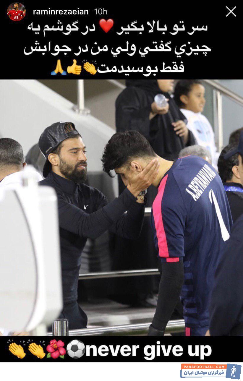 رامین رضاییان ، بازیکن تیم ملی که روز گذشته برای دیدن دیدار این تیم مقابل السد از نزدیک به ورزشگاه رفته بود، در صفحه شخصی خودش پیامی برای علیرضا بیرانوند منتشر کرد.