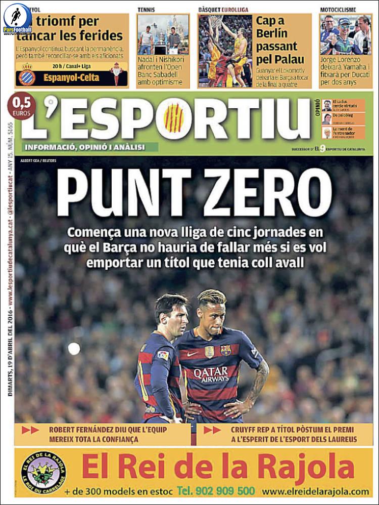 نگاهی داریم بر نیم صفحه نخست روزنامه اسپورتیو کاتالونیا، ۱۹ آوریل.