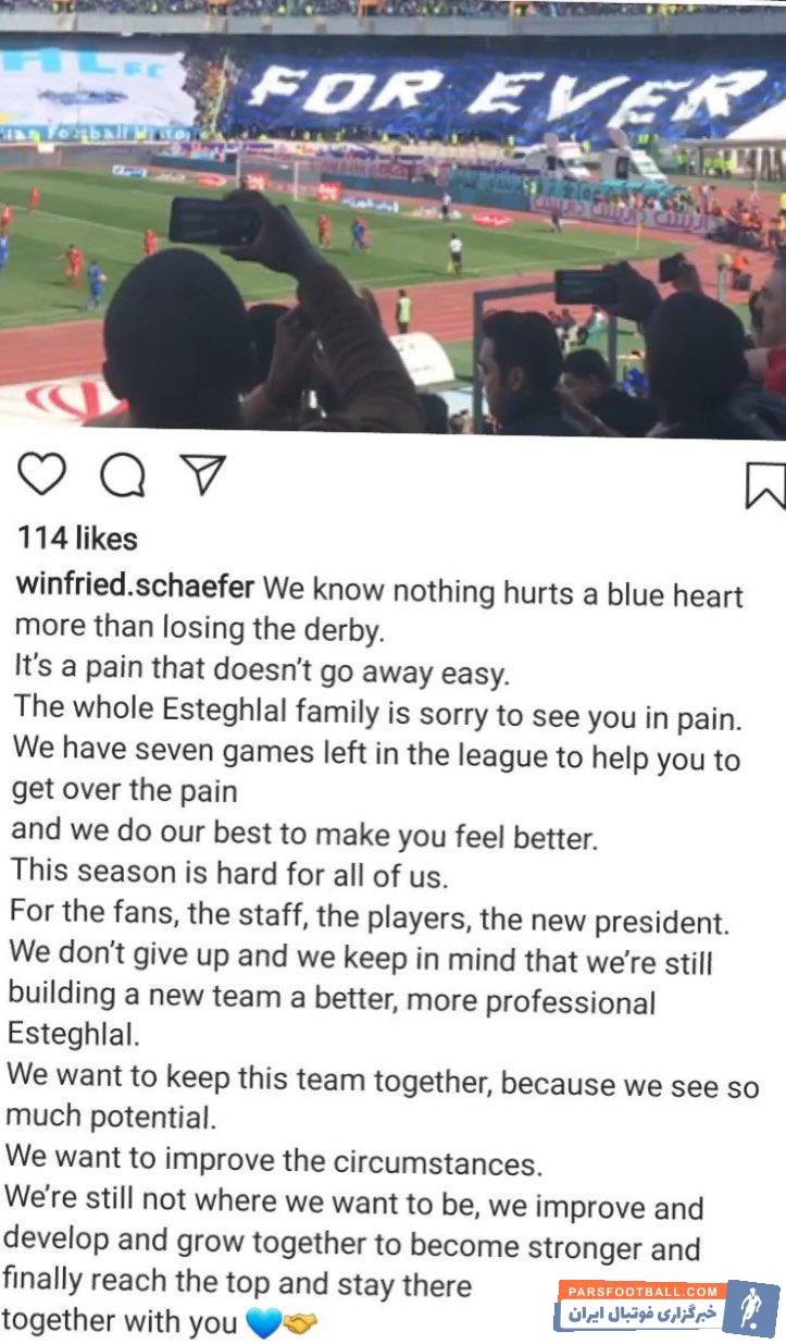 وینفرد شفر سرمربی آبی پوشان پایتخت اما امروز درباره بازی روز گذشته دو تیم اقدام به انتشار پستی اینستاگرامی کرد.