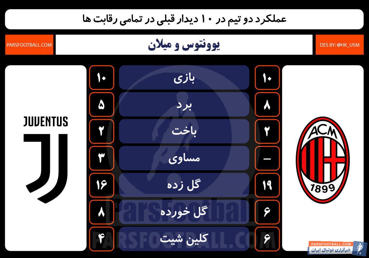 دو تیم فوتبال آث میلان و یوونتوس در رقابت های سری آ ایتالیا به مصاف هم خواهند رفت. به بررسی آمار و ارقام دو تیم در ده دیدار اخیر می پردازیم.