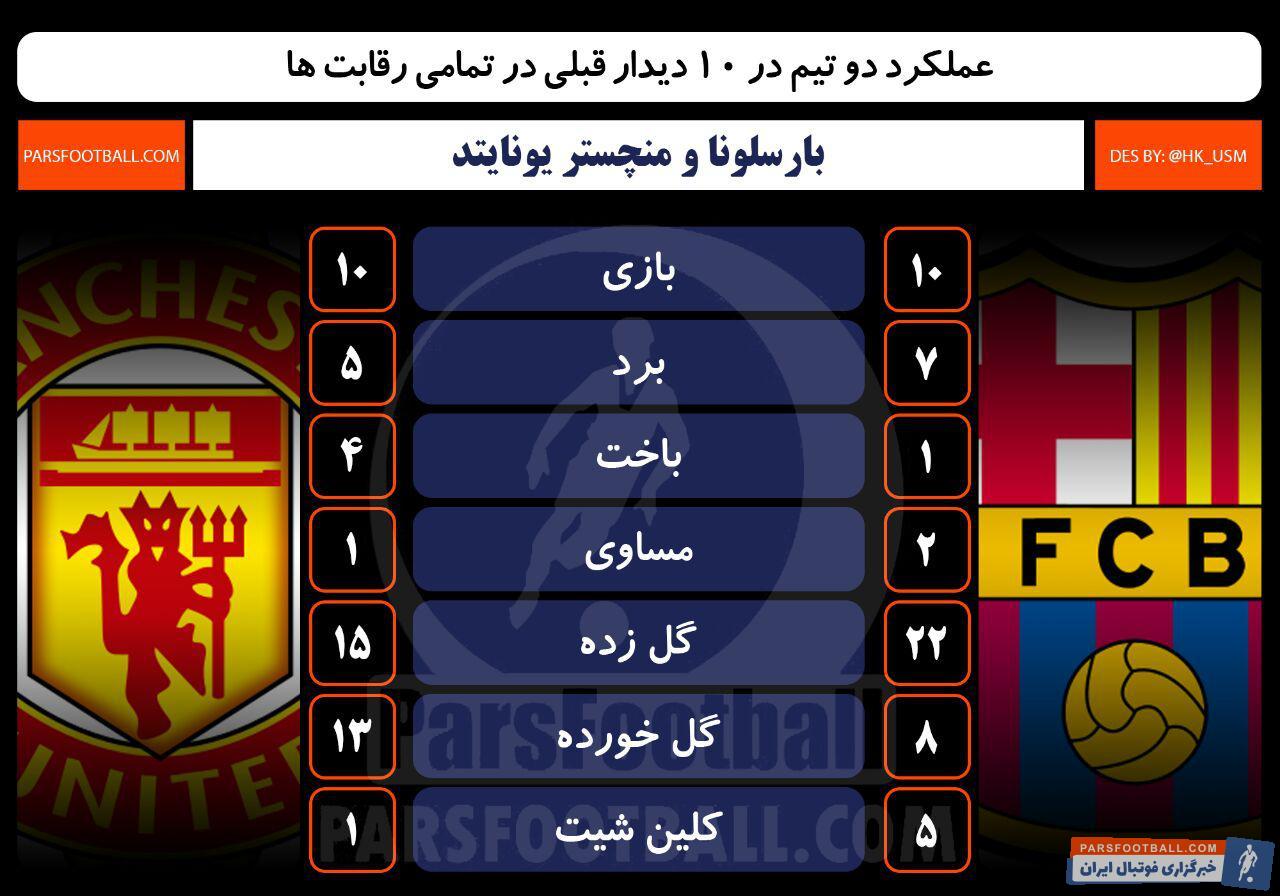 دو تیم بارسلونا و منچستریونایتد از سری رقابت های لیگ قهرمانان اروپا به مصاف هم می روند. به بررسی آمار دو تیم در ده دیدار اخیر می پردازیم.