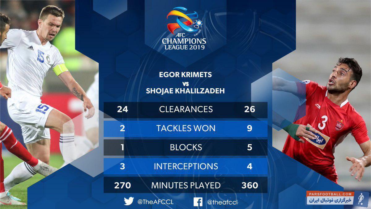 ارگان خبری کنفدراسیون فوتبال آسیا، در بخش لیگ قهرمانان با انتشار تصویر زیر، به ارائه اطلاعات آماری در خصوص عملکرد دو مدافع میانی پرسپولیس و پاختاکور پرداخت. از پرسپولیس، شجاع خلیل زاده و از تیم مقابل نیز ایگور کریمیتس برای انتشار آمار، انتخاب شدند و این اتفاق در حالی رخ میدهد که خلیل زاده برای بازی عصر امروز محروم است و نمیتواند سرخپوشان را همراهی کند!