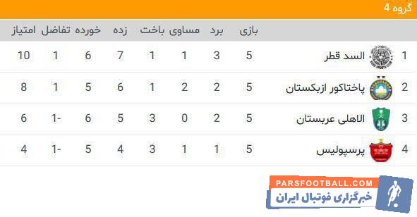 جدول گروه D پس از شکست پرسپولیس