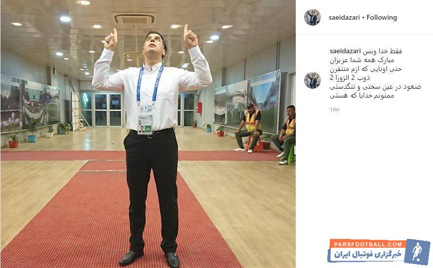 حالا مدیرعامل ذوبی ها که شب گذشته به همراه تیمش در کربلا به سر می برد اینگونه که در تصویر می بینیم خوشحال و شاکر خداوند است. پستی که آذری در صفحه اجتماعی خود بارگذاری کرده است او را در مسیر تشکر از خدای خود نشان داده است. از همین پیام کوتاه آذری و ترکیدن بغض وی بگذریم باید به این اشاره کنیم که او در متن نوشته خود هم یکی دو واژه را آورده است که مایه تعجب شده است. آذری در متن خود آورده است: