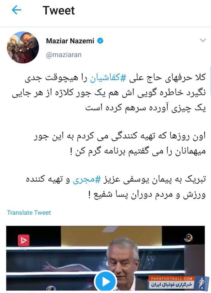 مازیار ناظمی در ادامه به شدت سخنان خود می‌افزاید و اینگونه ادامه می‌دهد: زمانی که من به عنوان تهیه کننده در صدا و سیما فعالیت می‌کردم به کسانی مانند علی کفاشیان می‌گفتند برنامه گرم کن. البته که باید به پیمان یوسفی در مورد هدایت برنامه ورزش و مردم بعد از فوت شفیع هم تبریک گفت.