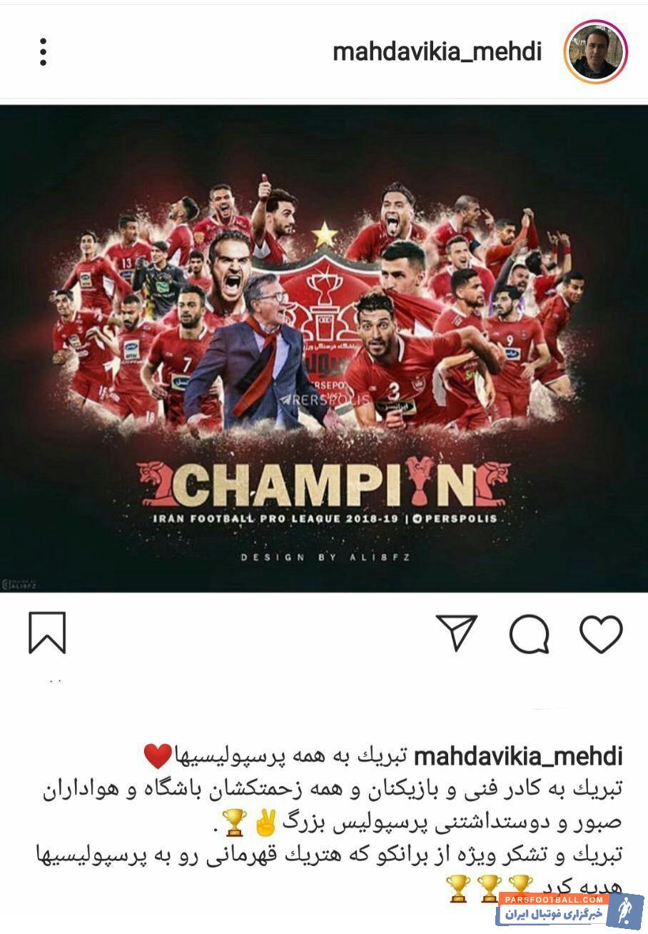 مهدوی کیا قهرمانی این تیم در فصل هجدهم را تبریک گفت مهدی مهدوی کیا  با انتشار پوستری جالب از پرسپولیسی ها، نوشت: تبریک به همه پرسپولیسی ها.