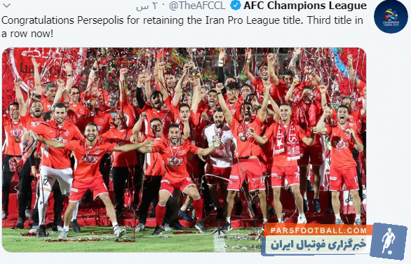 کنفدراسیون فوتبال آسیا سومین قهرمانی متوالی پرسپولیس در لیگ ایران را تبریک گفت.
