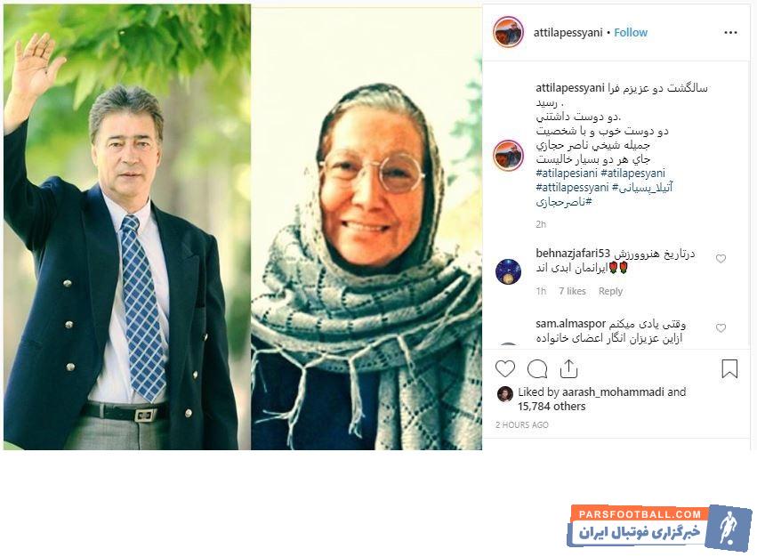 دوم خرداد، سالروز درگذشت ناصر حجازی اسطوره استقلال و تیم ملی ایران و همچنین سالروز درگذشت جمیله شیخی بازیگر توانمند سینماست. به همین بهانه آتیلا پسیانی بازیگر سینما و تئاتر با انتشار تصویری از دروازه بان افسانه ای فوتبال ایران و همچنین مادرش جمیله شیخی، سالروز درگذشت این دو را گرامیداشت و نوشت: