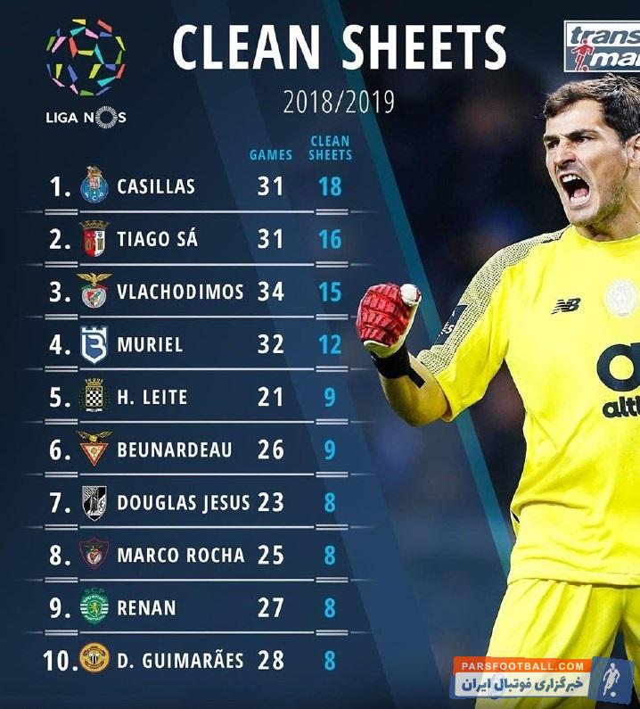 کاسیاس دروازهبان ۳۸ ساله اسپانیایی که در هفته گذشته در حین تمرین مورد حمله قلبی قرار گرفت و پس از گذراندن دوران نقاهت از بیمارستان مرخص شد، بیشترین کلینشیت را در لیگ پرتغال ثبت کرده است.
