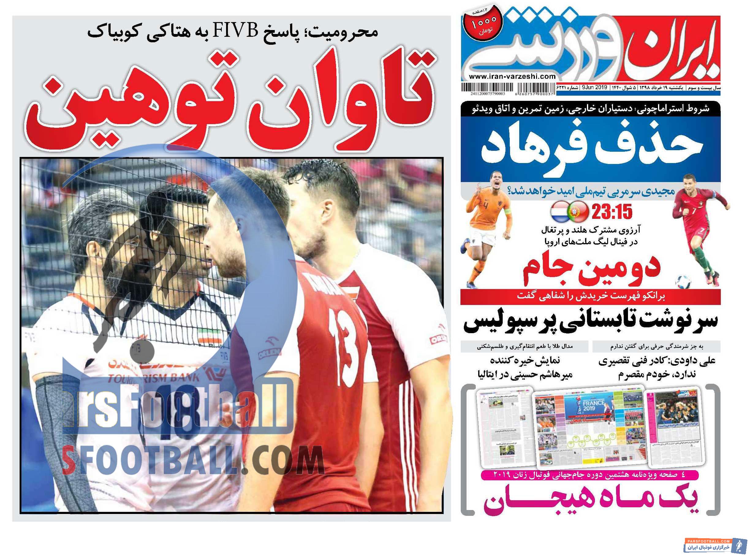عناوین روزنامه ایران ورزشی یکشنبه ۱۹ خرداد ماه به شرح زیر است :