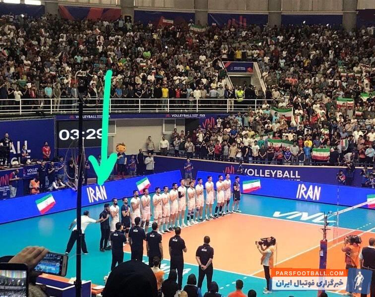 آخرین دیدار هفته سوم رقابتهای لیگ ملتهای والیبال ۲۰۱۹ در حالی با بازی تیمهای ایران و روسیه آغاز شد که در اجرای سرود تیم ملی جیمی جامپی به نرمی وارد زمین شد و لحظاتی در کنار سعید معروف قرار گرفت.