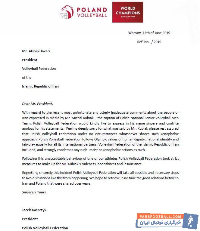 بدنبال اظهارات کاملاً ناپسند و ناخوشایند میشل کوبیاک کاپیتان تیم ملی لهستان در خصوص مرم ایران در رسانهها، فدراسیون والیبال لهستان در نظر دارد تا به نمایندگی از وی مراتب عذرخواهی خالصانه و فروتنانه خود را بابت این اظهارات ابراز کند. فدراسیون والیبال لهستان ضمن احساس تأسف شدید بابت اظهارات وی، اطمینان میدهد که این نهاد تحت هیچ شرایطی چنین نگاه متعصبانه و نژادپرستانهای نداشته و آن را ترویج نمیکند.