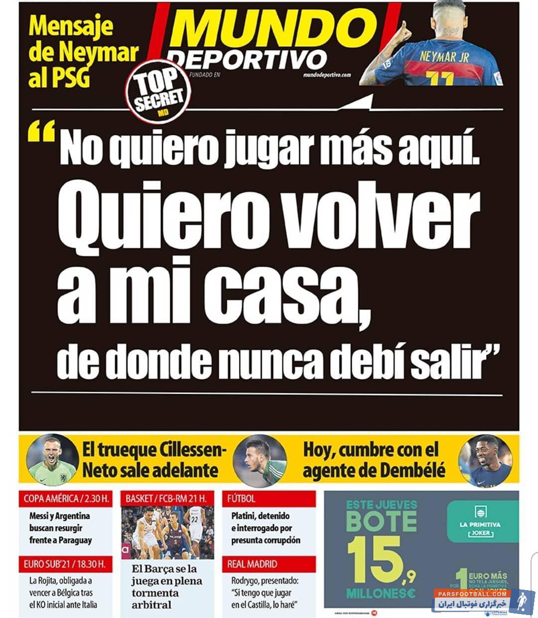 که ظاهراً به نظر نیمار برای ترک پاریس و باشگاه پاری سن ژرمن اشاره دارد. موندو در پایین تیتر اصلی هم از زیرتیتر دیگری استفاده کرده و نوشته: