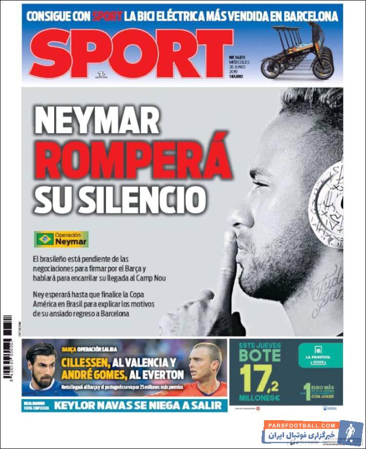 روزنامه اسپانیایی اسپورت که در کاتالونیا منتشر میشود صفحه اول امروز خود را به بحث انتقال نیمار، ستاره بزرگ برزیلی پاری سن ژرمن به باشگاه سابقش بارسلونا اختصاص داده و از تیتر نیمار سکوتش را میشکند استفاده کرده است. به ادعای این روزنامه بارسا از نیمار خواسته در این مرحله از تلاشها برای امکانپذیر کردن انتقال او به بارسلونا، وقت آن است که ستاره برزیلی سکوت خود را شکسته و علناً از قصدش برای پیوستن به آبی اناریها بگوید.