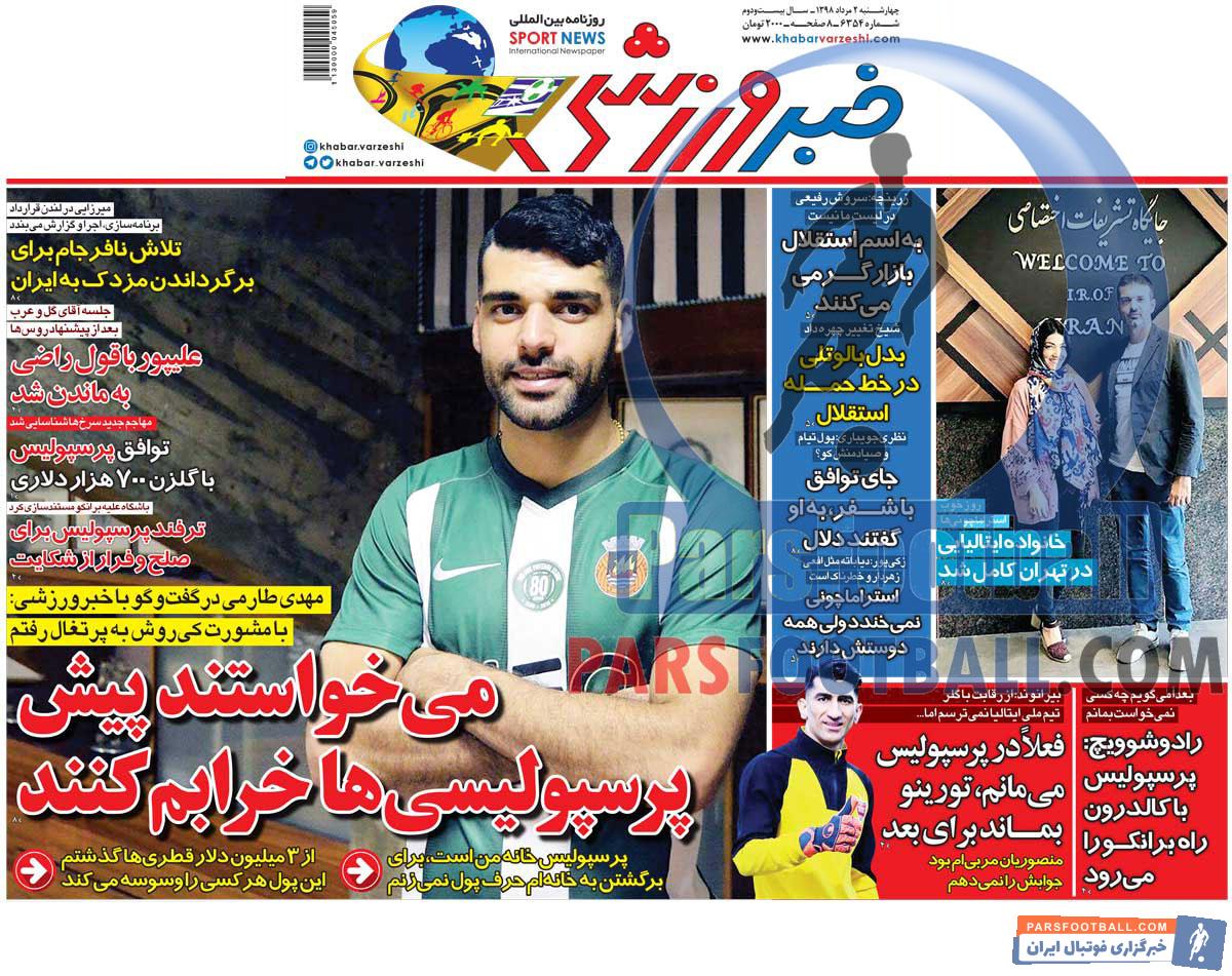 عناوین روزنامه خبر ورزشی چهارشنبه ۲ مرداد ماه به شرح زیر است :