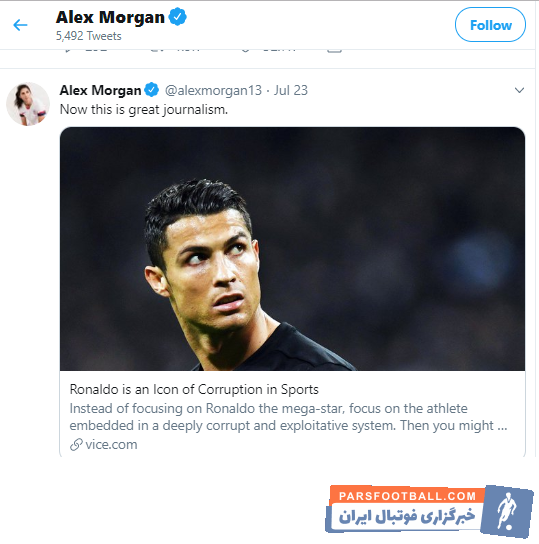 الکس مورگان، ستاره تیم ملی زنان ایالت متحده در ماه های اخیر رفتارهایی جنجالی از خود نشان داده و در تازه ترین اقدام به کریستیانو رونالدو ، ستاره ۳۴ ساله تیم ملی پرتغال و یوونتوس حمله کرده است.