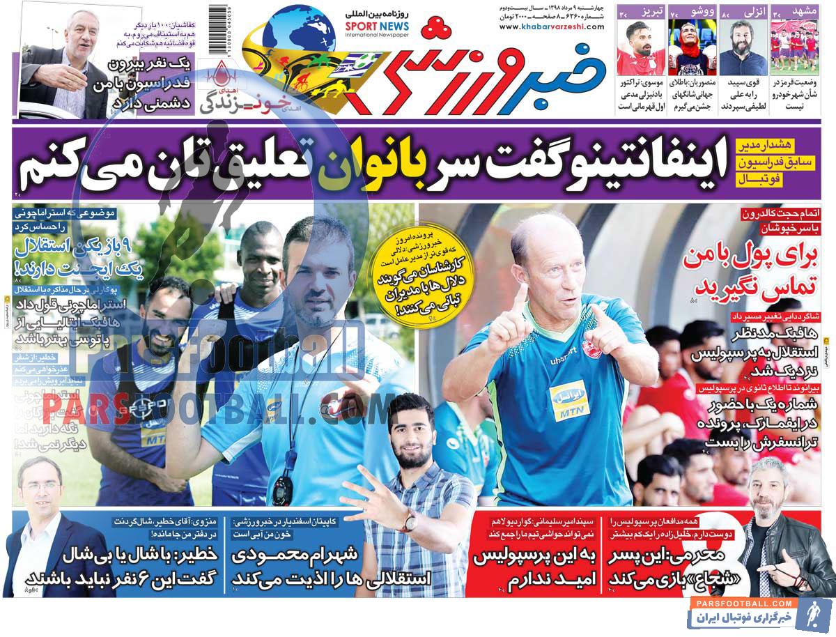 عناوین روزنامه خبر ورزشی چهارشنبه ۹ مرداد ماه به شرح زیر است :
