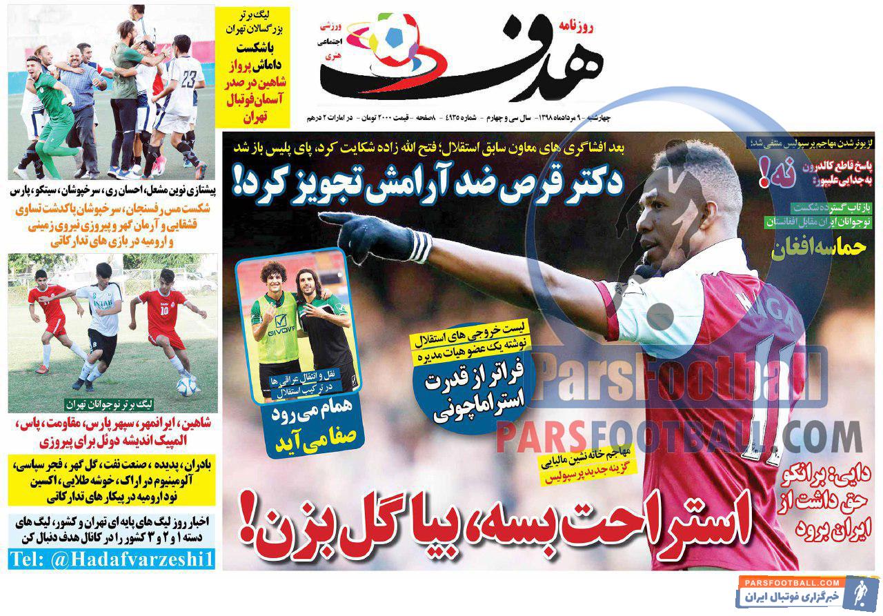 عناوین روزنامه هدف چهارشنبه ۹ مرداد ماه به شرح زیر است :