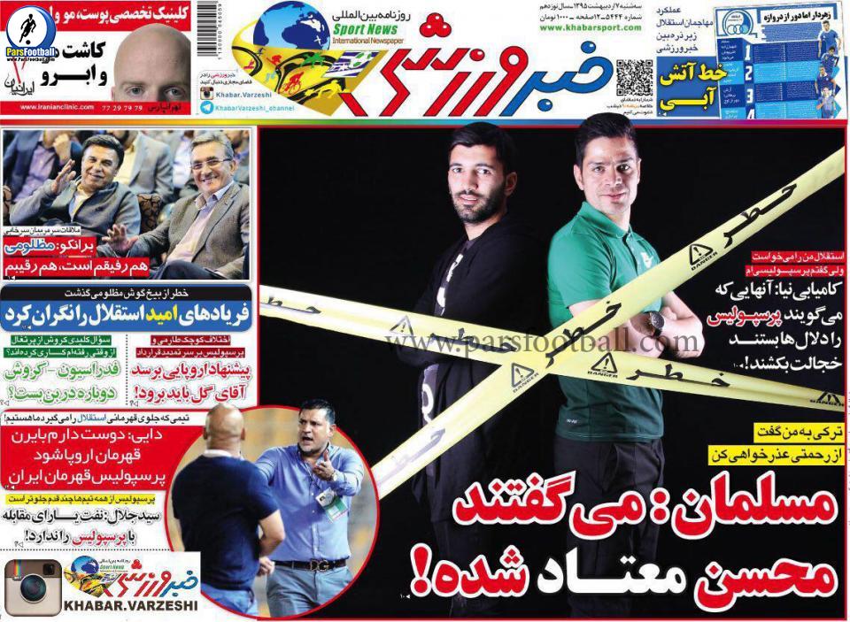 نگاهی داریم به نیم صفحه نخست روزنامه خبر ورزشی ، سه شنبه ۷ اردیبهشت .