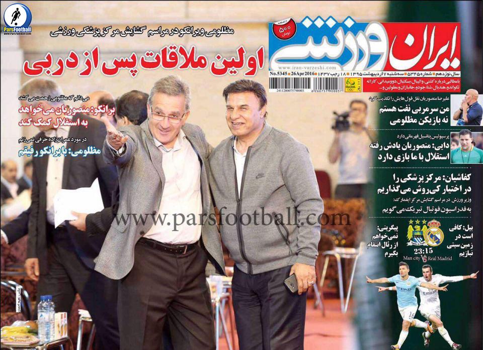 روزنامه ایران ورزشی ۷ اردیبهشت | اولین ملاقات پس از دربی | برانکو : منصوریان می خواهد به استقلال کمک کند | مظلومی: با برانکو رفیقم