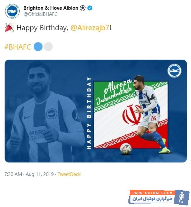 علیرضا جهانبخش وینگر ایرانی برایتون ۲۶ ساله شد و باشگاه برایتون در حساب توئیتری خود تولد او را تبریک گفت.