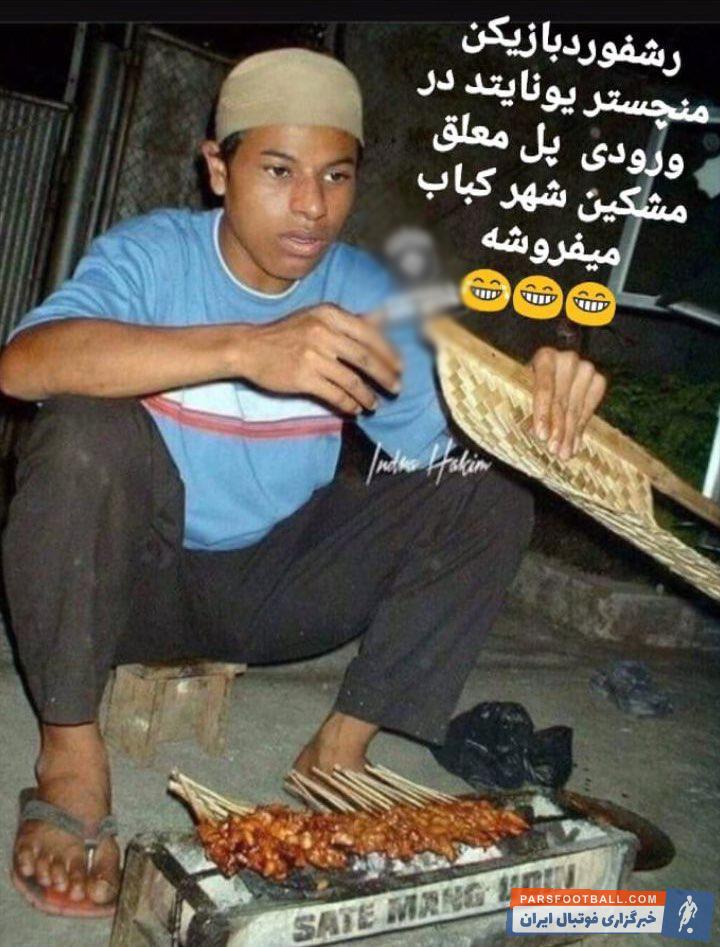 تصویری از بدل ایرانی مارکوس رشفورد در حال فروش کباب را مشاهده می کنید.