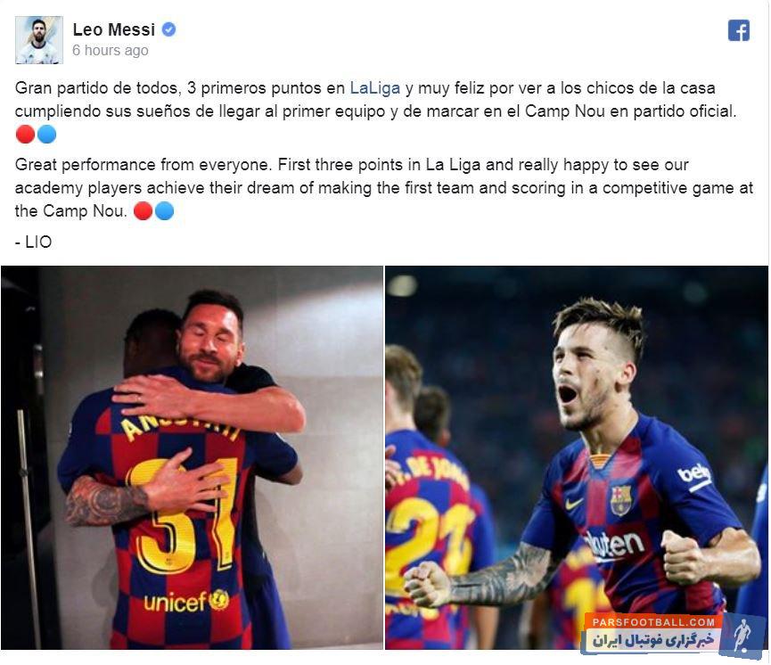 لیونل مسی، کاپیتان بارسلونا بعد از پیروزی دیشب تیمش مقابل بارسا در شبکههای اجتماعی از دو بازیکن جوان این تیم کارلس پرز و آنسو فاتی تمجید کرد.