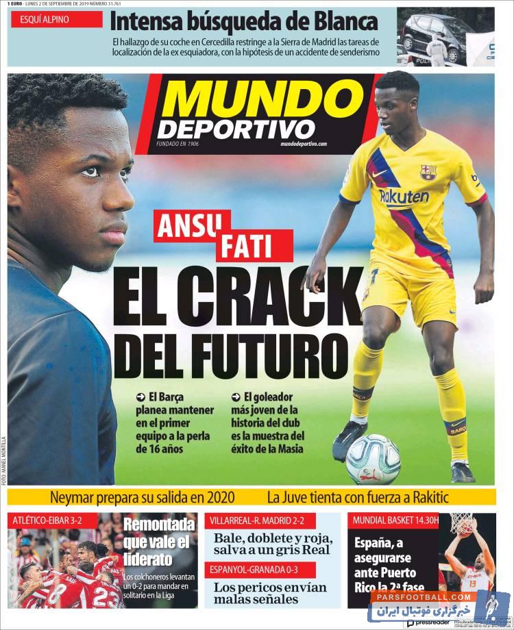 روزنامه اسپانیایی موندو دپورتیوو که در کاتالونیا منتشر میشود و از رسانههای نزدیک به بارسا است امروز روی جلد خود را به آنسو فاتی ، پدیده جوان بارسلونا اختصاص داده که اخیرا چندین بار در این تیم خبرساز شده است. او در بازی قبلی بارسا مقابل اوساسونا موفق به گلزنی شد تا نام خود را به عنوان جوانترین گلزن تاریخ باشگاه کاتالان ثبت کرده و پیش از آن هم به دومین بازیکن جوان تاریخ این تیم تبدیل شده بود. حالا موندو از فاتی به عنوان طلیعه آینده یاد کرده و از اهمیت بسیار زیاد او برای ارنستو والورده و کادر فنی بارسا میگوید.