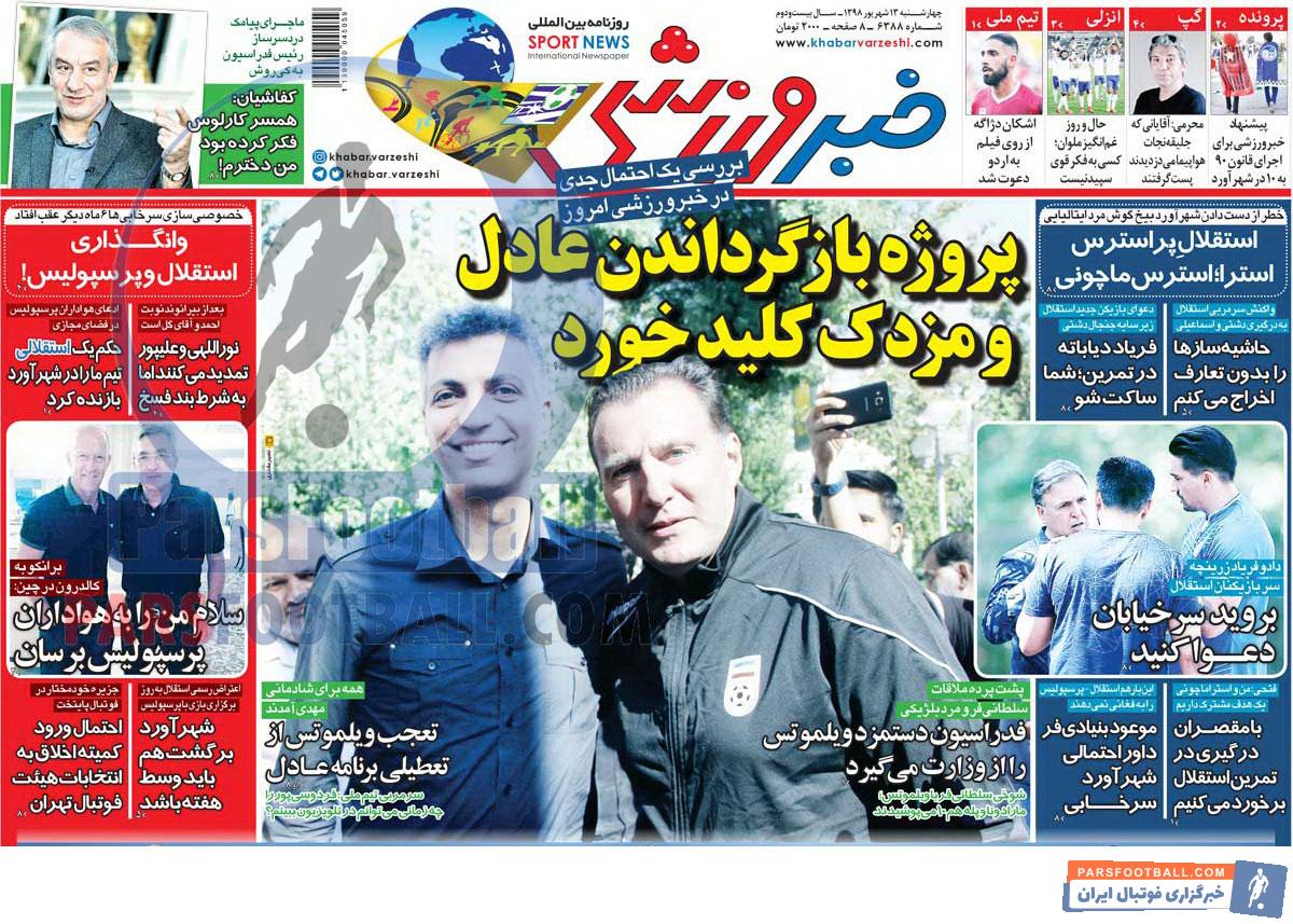 عناوین روزنامه خبر ورزشی چهارشنبه ۱۳ شهریور ماه به شرح زیر است :