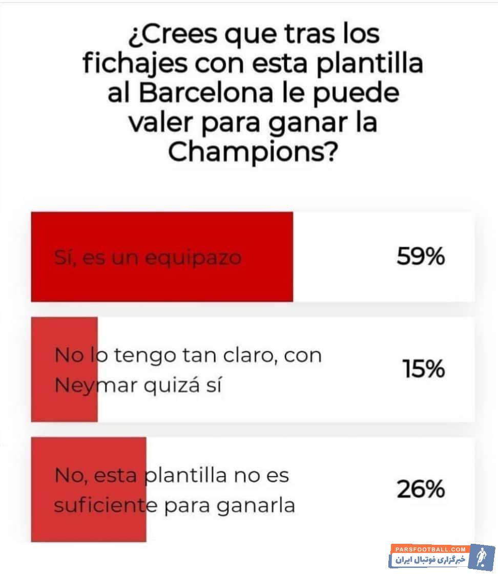 هواداران آبی اناری ها اما با اتفاق نظر ۵۹ درصدی معتقد هستند بارسلونا امسال موفق به کسب لیگ قهرمانان میشود؛ ۱۵ درصد از شرکت کننده های این نظر سنجی معتقدند اگر نیمار به جمع آبی اناری ها باز میگشت این تیم موفق به کسب این عنوان می شد؛ ۲۶ درصد باقی مانده هم بر این باورند که بارسلونا امسال هم در کسب عنوان لیگ قهرمانان اروپا ناکام خواهد ماند.