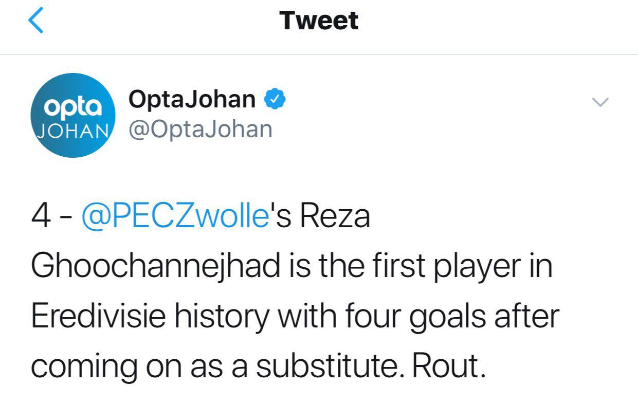 رکورد به ثمر رساندن چهار گل به عنوان یار تعویضی از رضا قوچاننژاد در لیگ هلند
