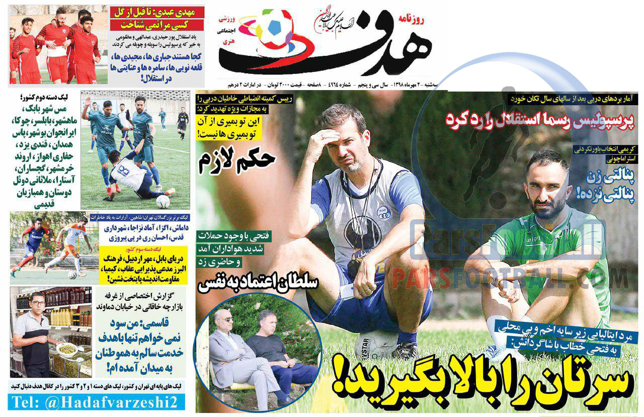مرور عناوین مهم روزنامه هدف ورزشی سه شنبه 2 مهر