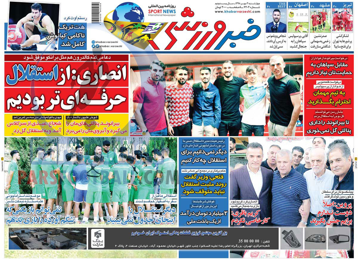 عناوین روزنامه خبر ورزشی چهارشنبه ۳ مهر ماه به شرح زیر است :