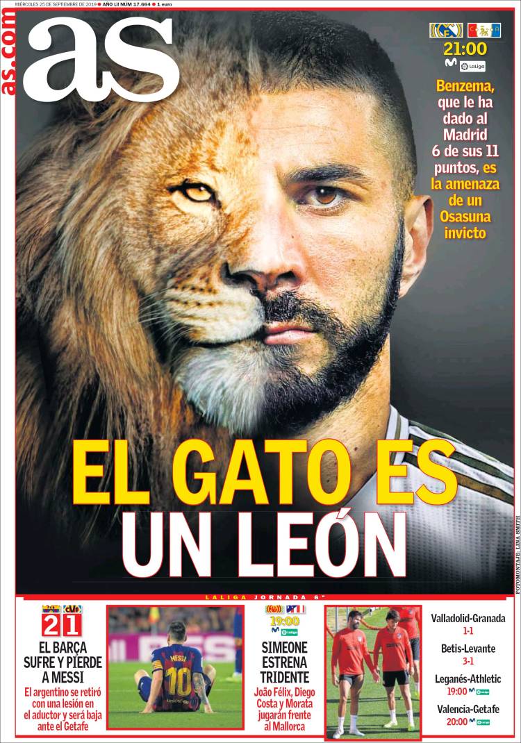 روزنامه اسپانیایی آ اس امروز صفحه اول خود را به کریم بنزما، مهاجم فرانسوی رئال مادرید اختصاص داده و به بهانه درخشش او در شروع فصل جاری لالیگا از تیتر “این گربه، شیر است” استفاده کرده.