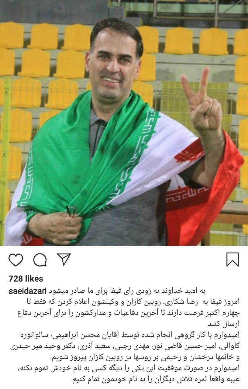 حالا جدیدترین به روز رسانی مربوط به پست اینستاگرامی سعید آذری است. این مدیر پیشین ذوب آهن در صفحه شخصی خود اعلام کرده که رای فیفا به زودی صادر می شود. او می گوید پیروزی در پرونده مربوط به شکاری و باشگاه های روسیه ای نزدیک است و تیم وکلای به خدمت گرفته شده توسط ذوب آهن در آستانه پیروزی نهایی در این پرونده هستند.