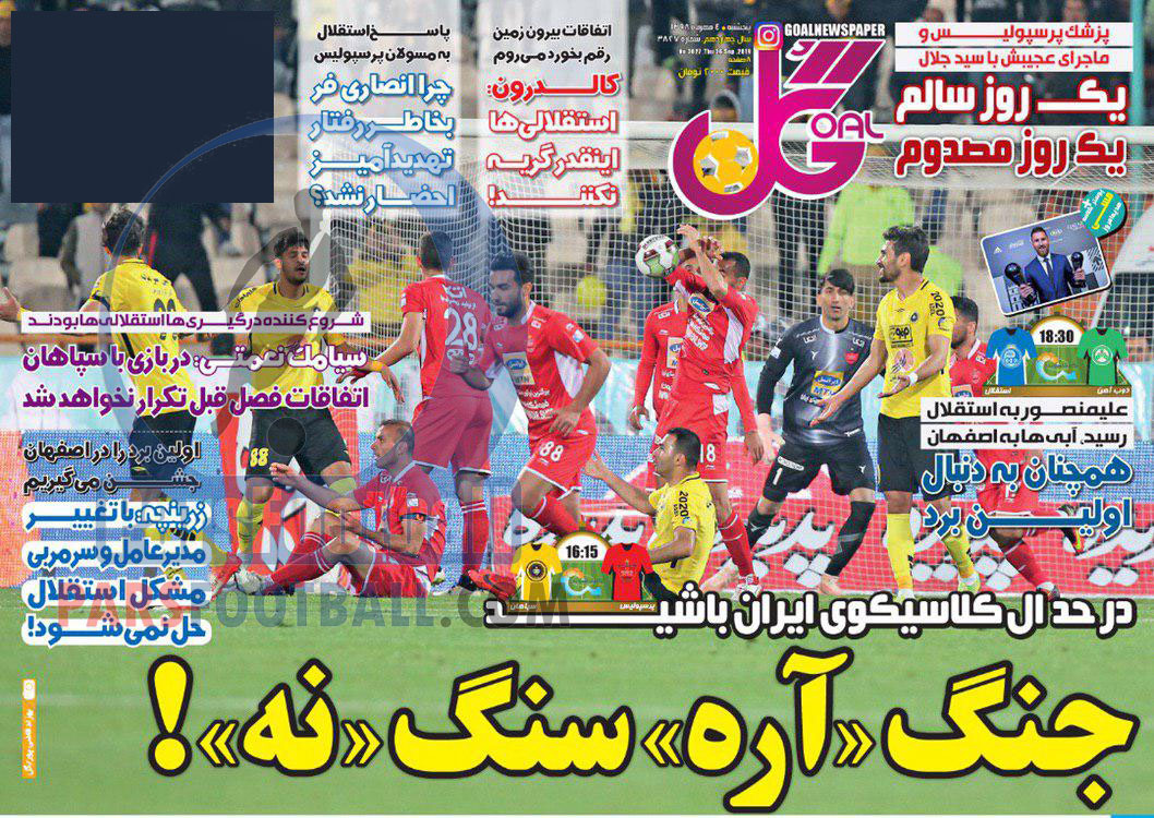 عناوین روزنامه گل پنجشنبه ۴ مهر ماه به شرح زیر است :