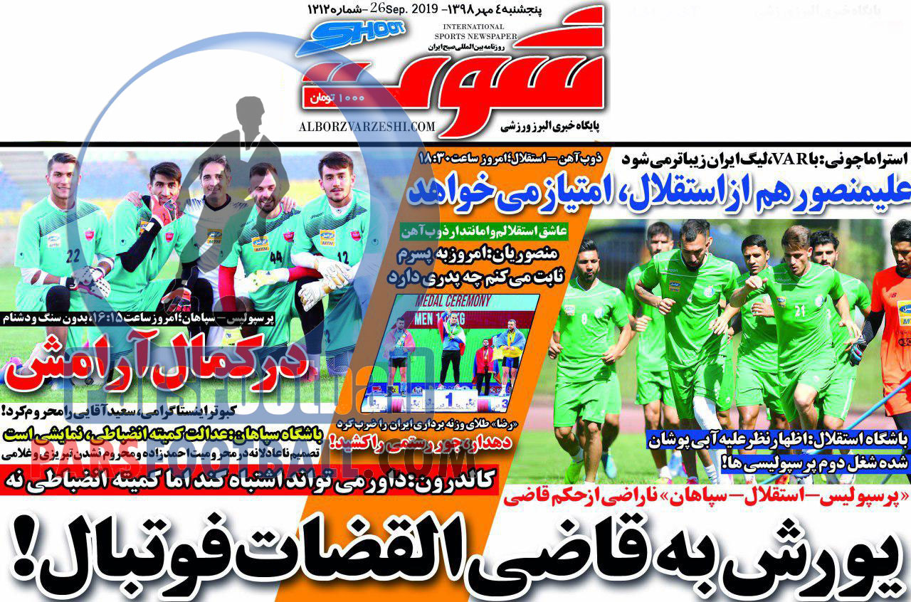 عناوین روزنامه شوت پنجشنبه ۴ مهر ماه به شرح زیر است :