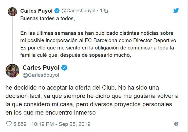 ” در هفتههای اخیر، چندین خبر و گزارش درباره احتمال همکاری من با باشگاه بارسلونا به عنوان مدیر ورزشی مطرح شده. به همین خاطر احساس کردم وظیفه دارم به خانواده بارسلونا اعلام کنم که بعد از سبک و سنگین کردن این پیشنهاد تصمیم گرفتهام پیشنهاد باشگاه را نپذیرم”.