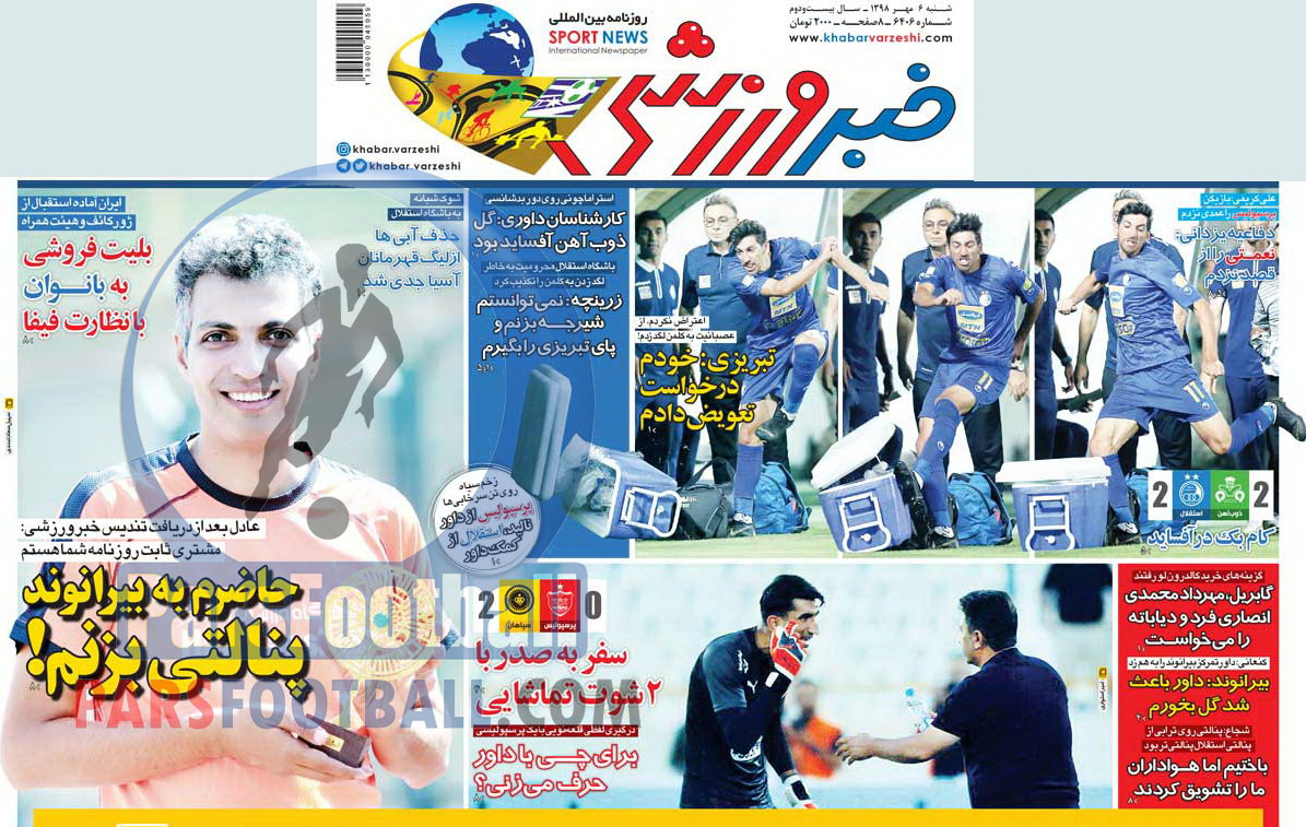 عناوین روزنامه خبر ورزشی شنبه ۶ مهر ماه به شرح زیر است :