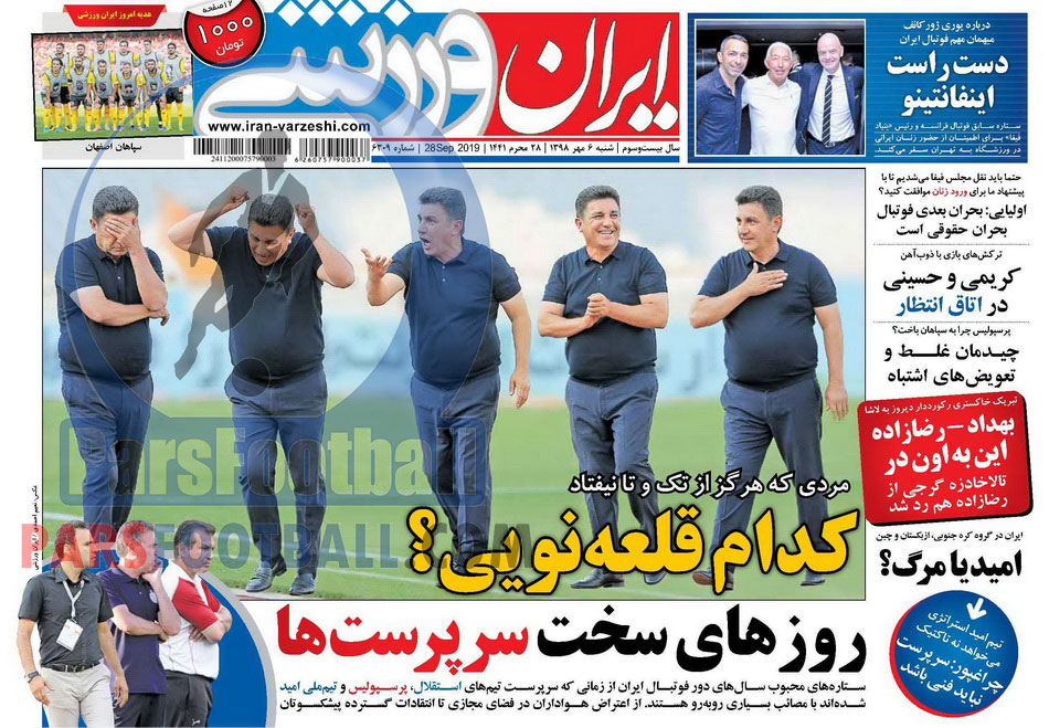 عناوین روزنامه ایران ورزشی شنبه ۶ مهر ماه به شرح زیر است :