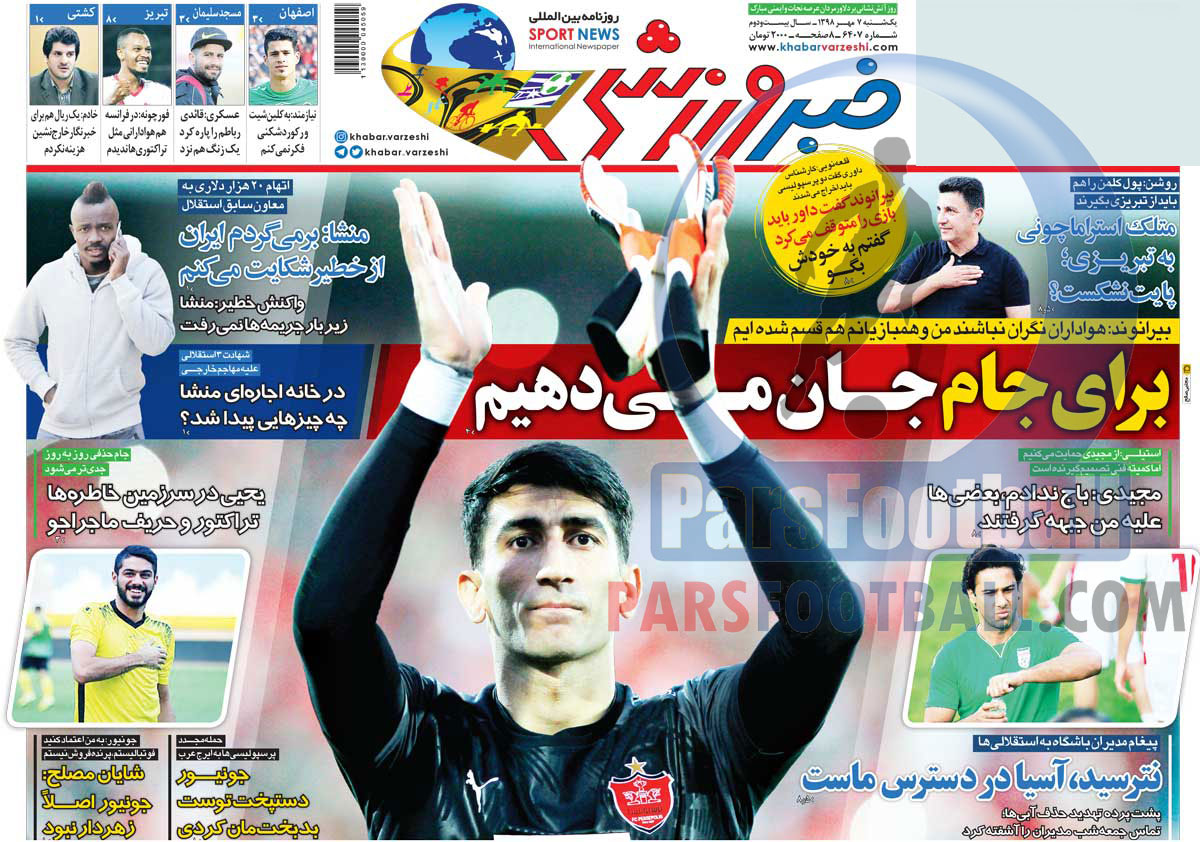 عناوین روزنامه خبر ورزشی یکشنبه ۷ مهر ماه به شرح زیر است :