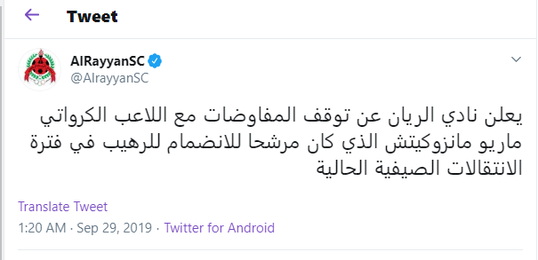 باشگاه الریان رسما از منتفی شدن مذاکرات خود با ماریو مانژوکیچ، ستاره کروات یوونتوس خبر داد.