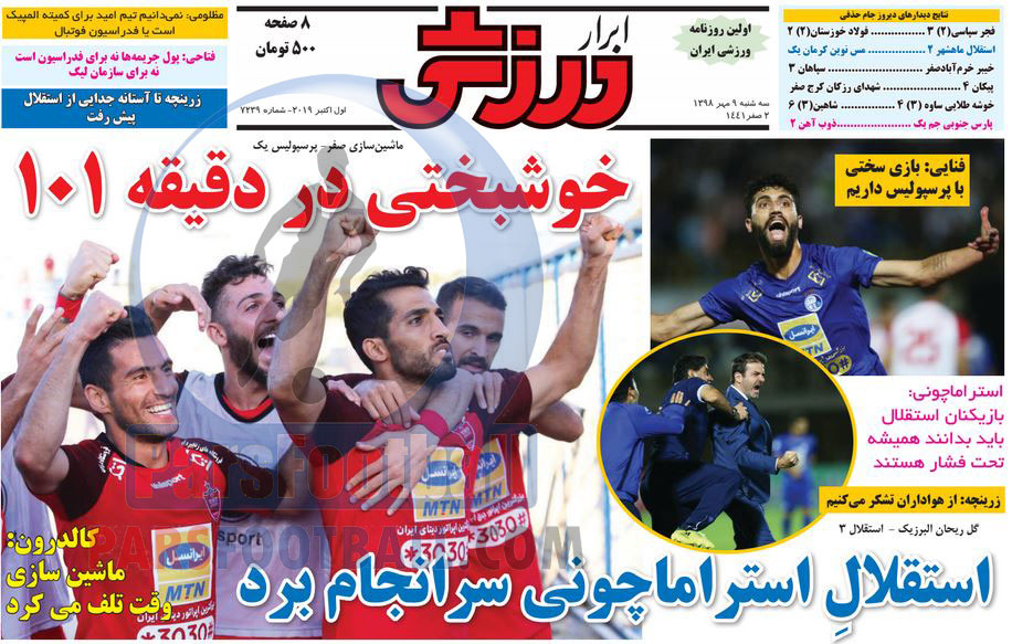 عناوین روزنامه ابرار ورزشی سه شنبه ۹ مهر ماه به شرح زیر است :