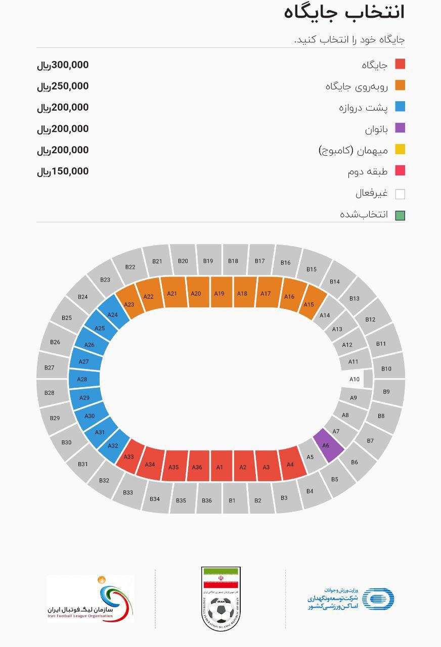 بلیت جایگاه مربوط به بانوان در حالی فروخته شده که سکوهای دیگر هنوز صندلیهای قابل خرید پرتعدادی دارند. در قسمت روبروی جایگاه کمتر از ۱۰۰۰ بلیت به فروش رفته و در قسمت جایگاه نیز فعلا بلیت زیادی فروخته نشده است. لازم به ذکر است که بلیت جایگاه ۳۰ هزار تومان، روبروی جایگاه ۲۵ هزار تومان، بانوان ۲۰ هزار تومان، پشت دروازه ۲۰ هزار تومان، میهمان ۲۰ هزار تومان و طبقه دوم با قیمت ۱۵ هزار تومان به فروش میرود.