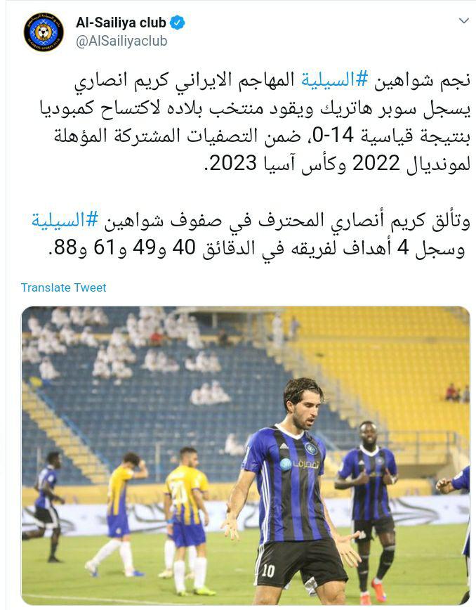 تیم ملی ایران امروز موفق شد تا ۱۴-۰برابر کامبوج به پیروزی برسد که کریم انصاری فرد مهاجم تیم ملی در این دیدار چهار گل به ثمر رساند و پوکر کرد. باشگاه السیلیه قطر که کریم انصاری فرد در این تیم توپ می زند، به این اتفاق مهم واکنش نشان داد و اینگونه درخشش ستاره اش را به گوش مخاطبان خود در توئیتر رساند.