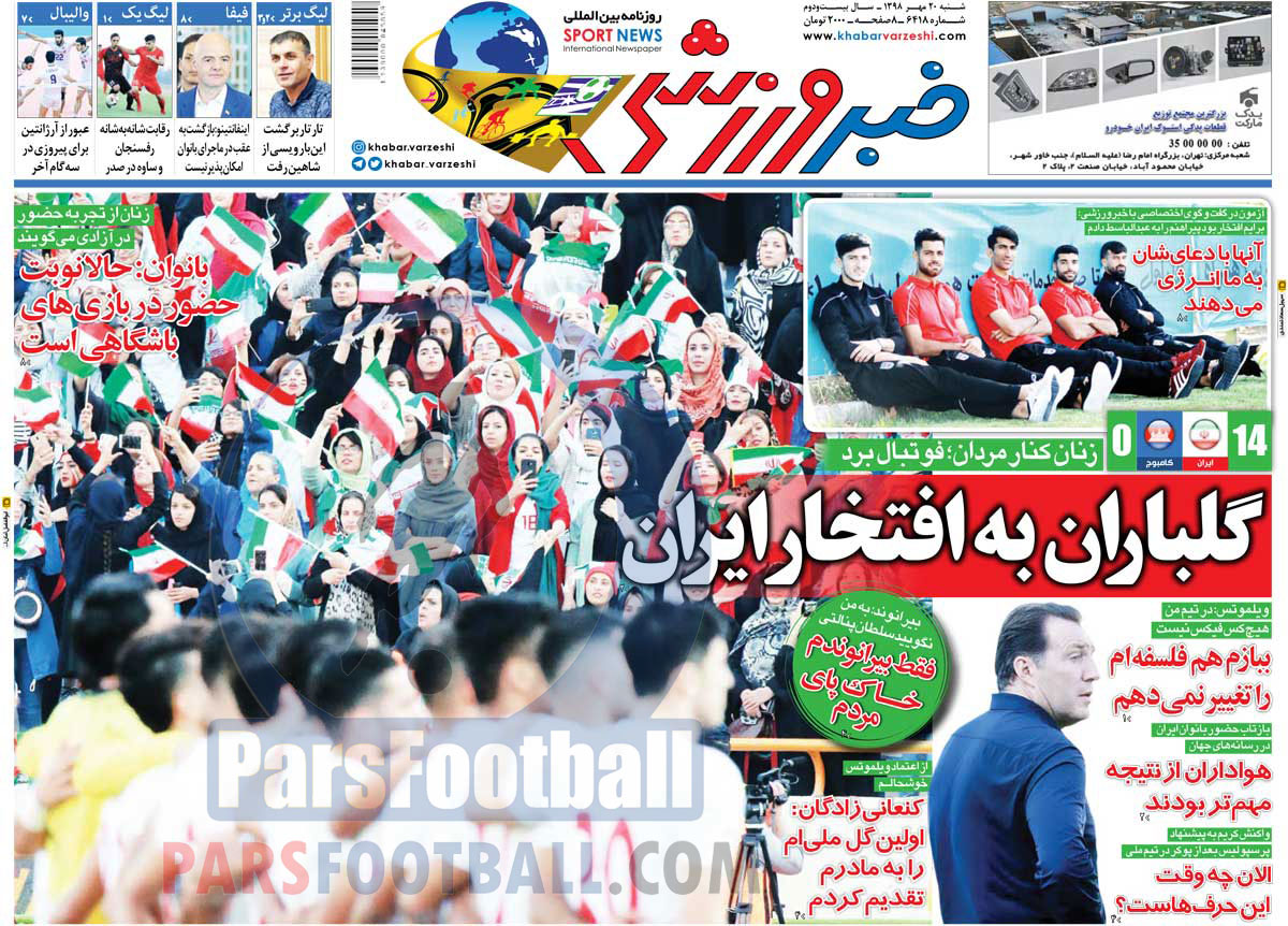 عناوین روزنامه خبر ورزشی شنبه ۲۰ مهر ماه به شرح زیر است :