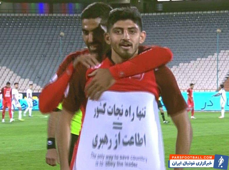 گفتنی است مهدی ترابی بعد از گلزنی با حرکت به سمت دوربینهای تلویزیونی، ضمن بالا زدن لباس تیم پرسپولیس، نوشتهای را که در تیشرت زیرین آن بود به معرض دید رسانهها و تماشاگران گذاشت؛ بر روی تیشرت مهدی ترابی این عبارت که “تنها راه نجات کشور = اطاعت از رهبری” نقش بسته بود.